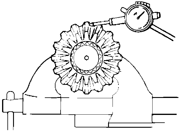 4. Assemble the differential case into the housing (less pinion). Install bearing caps and finger tight bolts. Mount a dial indicator with a magnetic base to the housing and indicate on the flange or head of screw.
