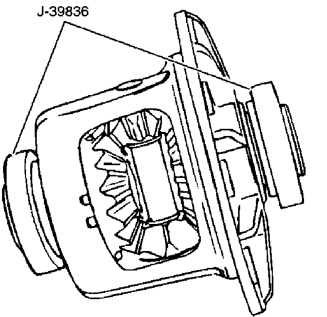 1. Install pinion bearing races and baffle plate using outer bearing race installer J-8611-01/inner bearing race installer J-42836 and drive handle J-8592.
