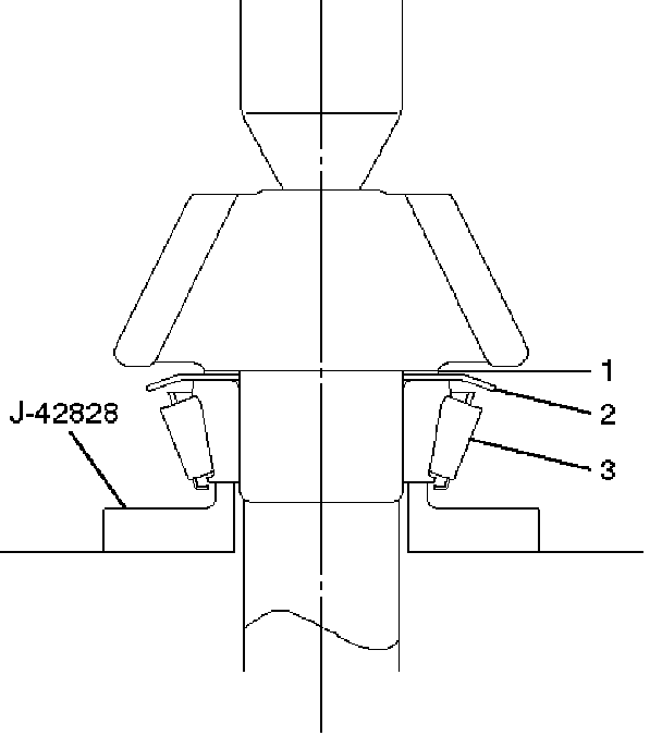 1. Place the shim (1) and inner oil slinger (2) on the pinion gear, then install the pinion inner bearing (3) using installer J-42828.