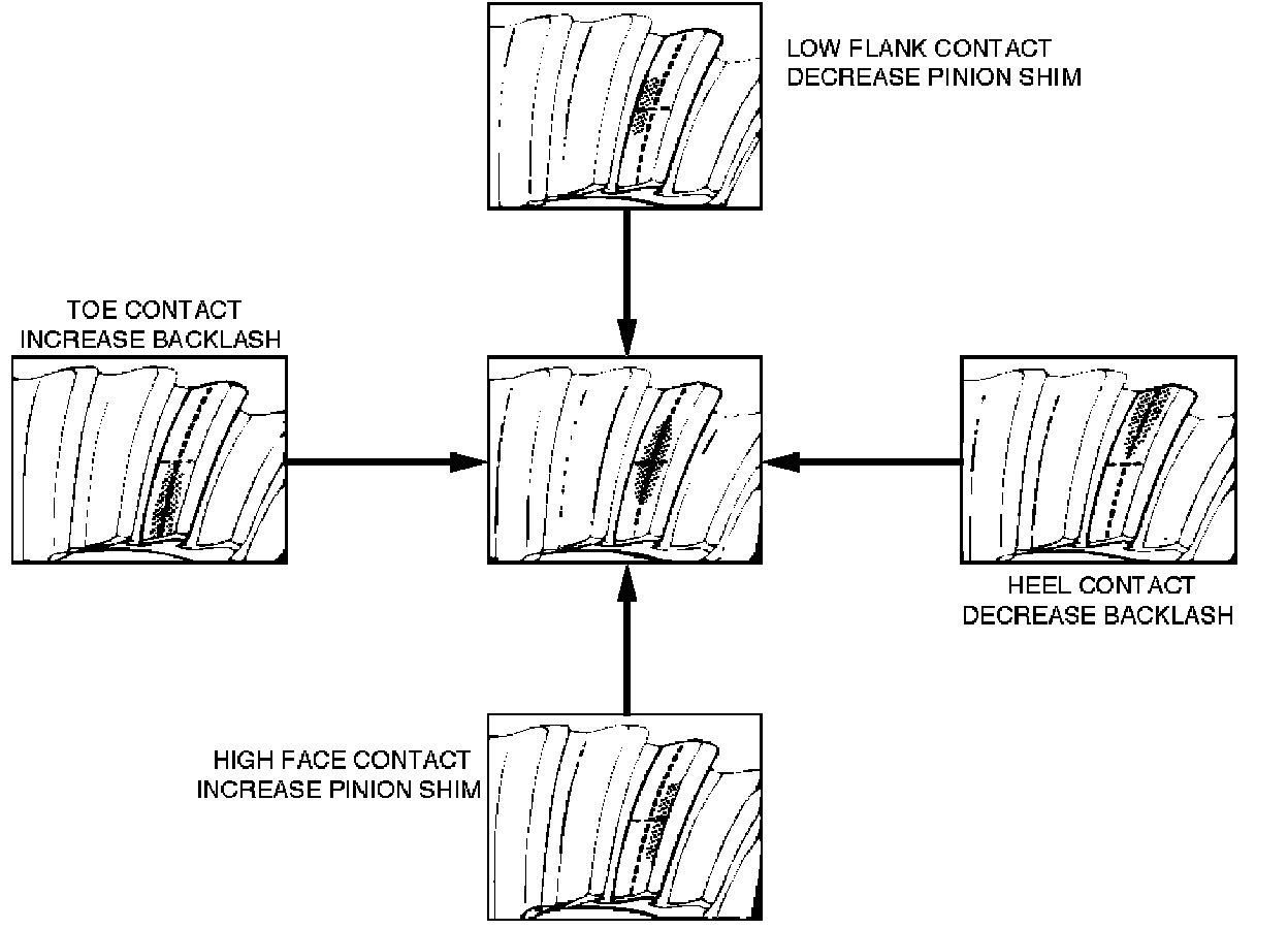Two adjustments can be made which will affect tooth contact pattern: backlash, and the position of the drive pinion in the case. The effects of bearing preloads are not readily apparent on head loaded tooth contact pattern tests; however, these adjustments should be within specifications before proceeding with backlash and drive pinion adjustments.