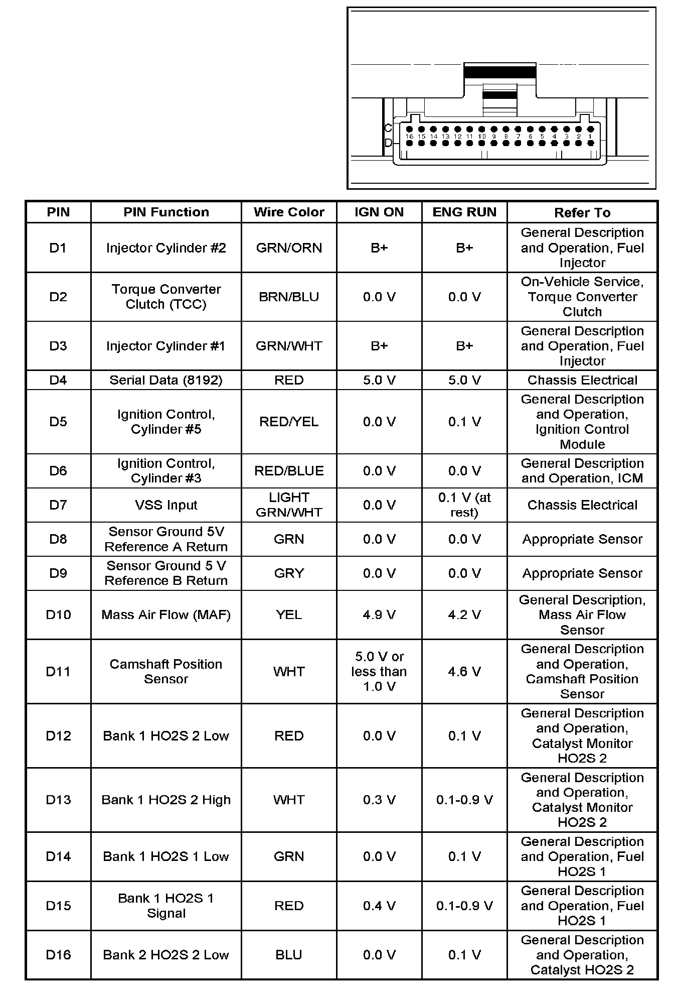 PCM Pinout Table, 32-Way Red Connector - Row "D":