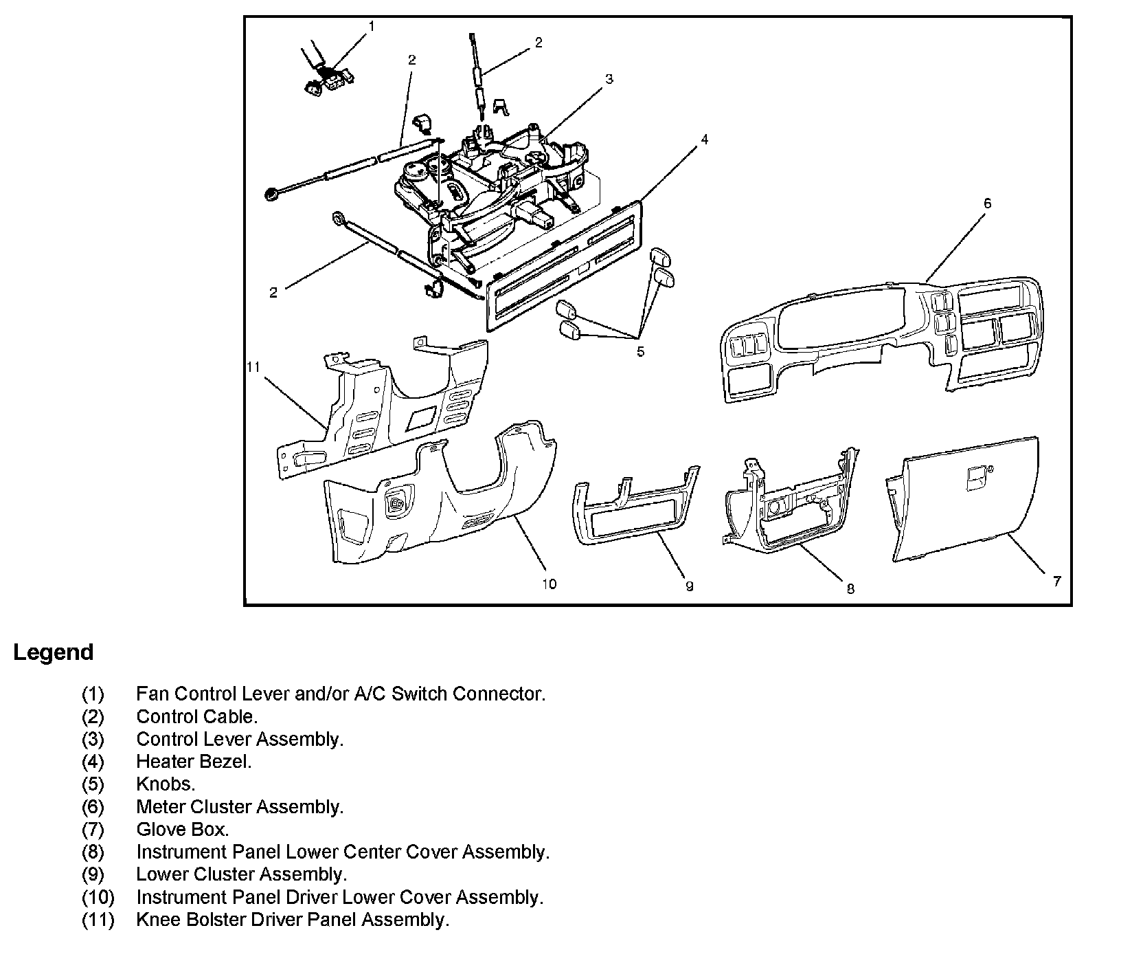 11. Remove fan control lever and/or air conditioning (A/C) switch connector.