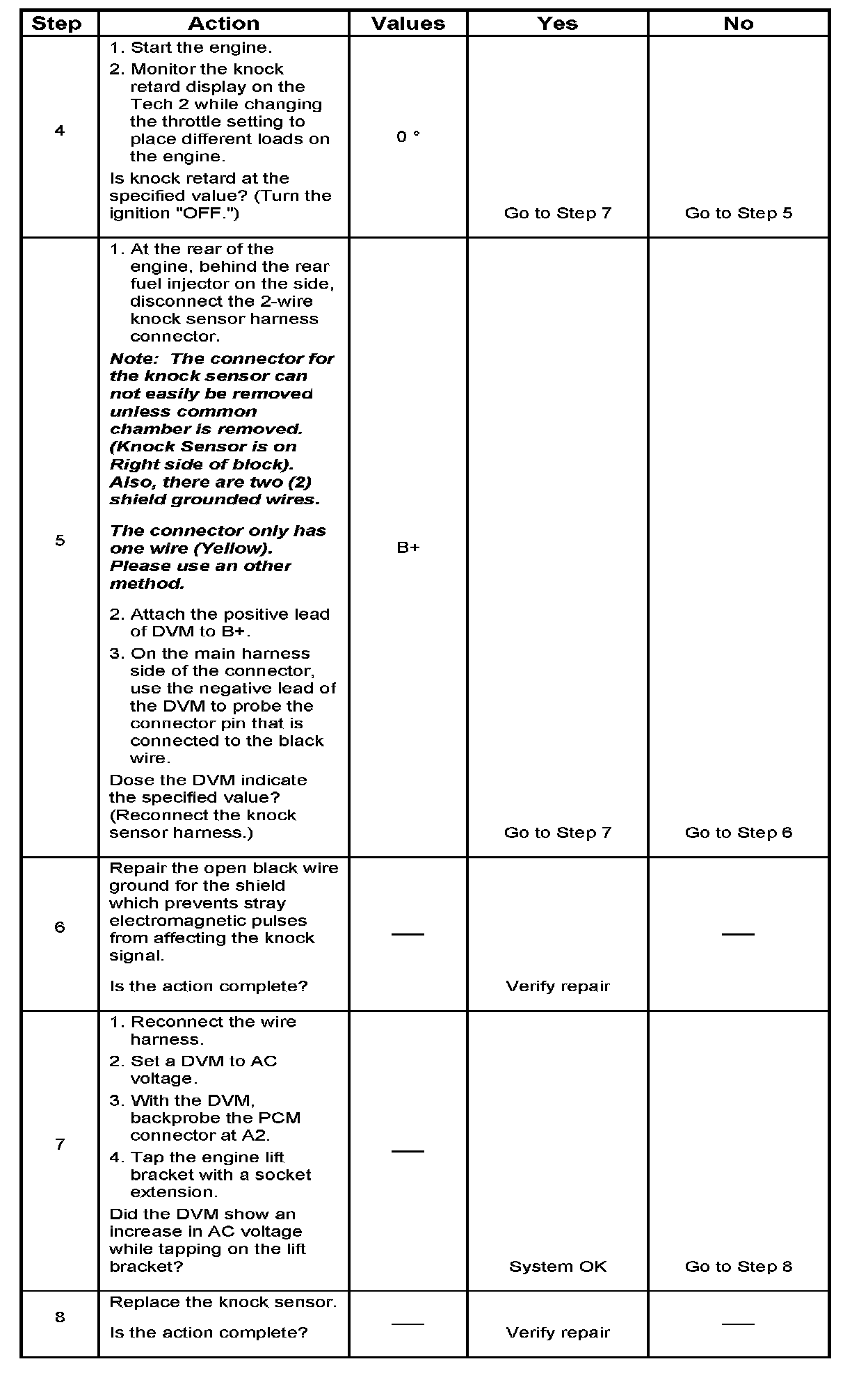 7. The change in signal speed depends on how hard the tapping is done. Normally there is about 1.5 to 10 mV at PCM pin A2 with the engine off. Loud tapping should be able to make the reading jump to 20 - 25 mV AC.