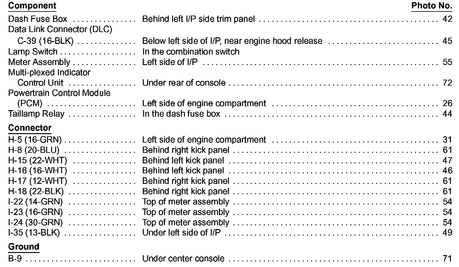 Multi-Plexed Indicator System Component Location Index: