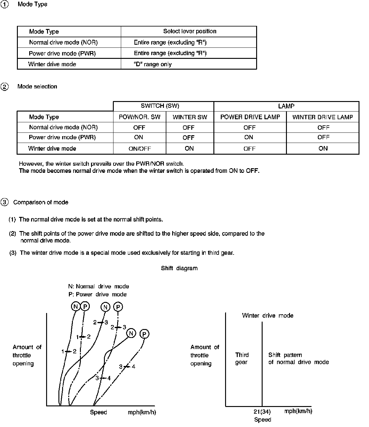 The shift pattern is identical to NORMAL mode except 3-4 and 4-3 shift lines at low throttle modified to get engine braking on a larger speed range.