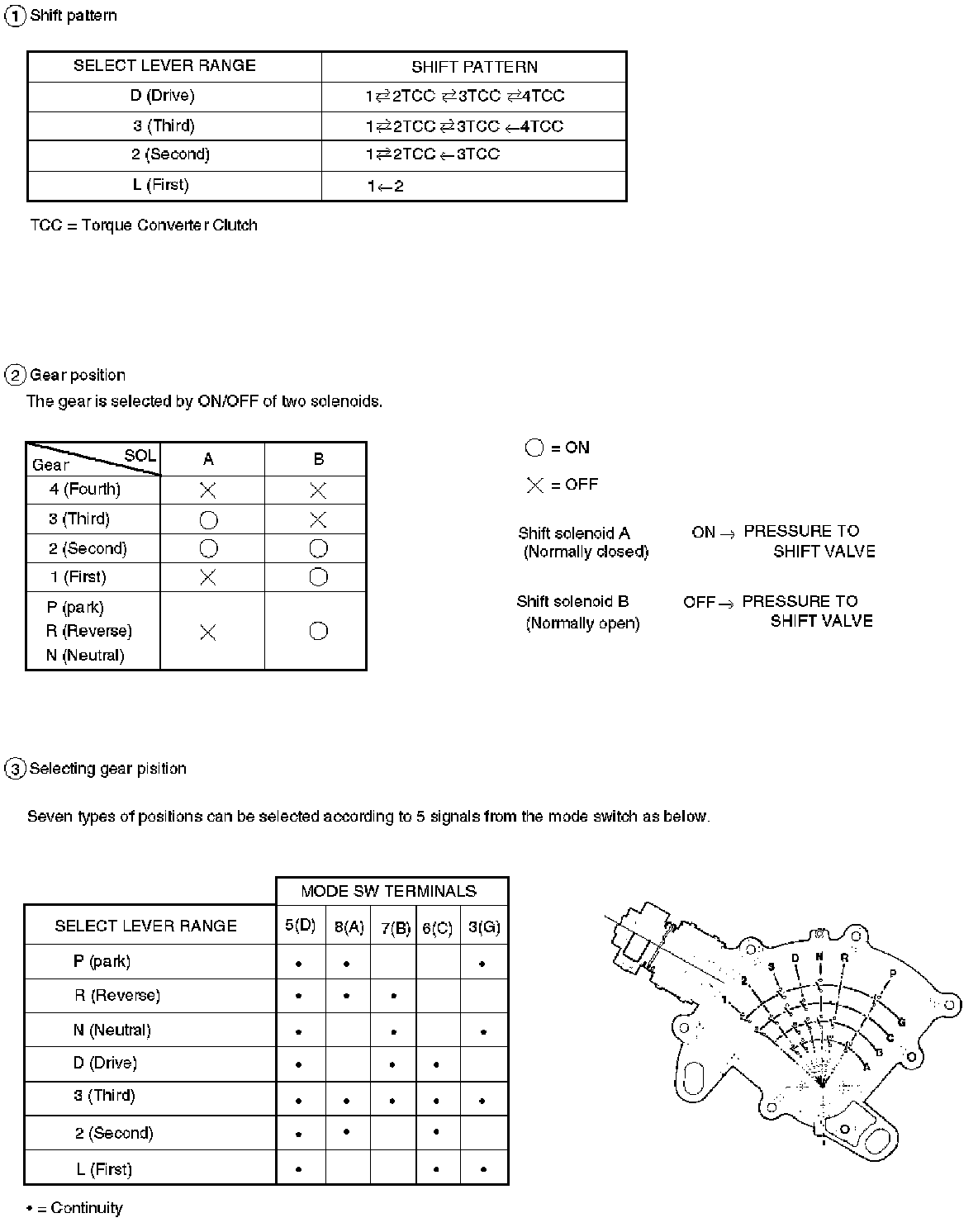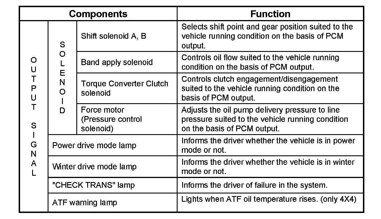 The transmission gear is shifted according to the shift pattern selected by the driver. In shifting gears, the gear ratio is controlled by the ON/ OFF signal using the shift solenoid A and the shift solenoid B.