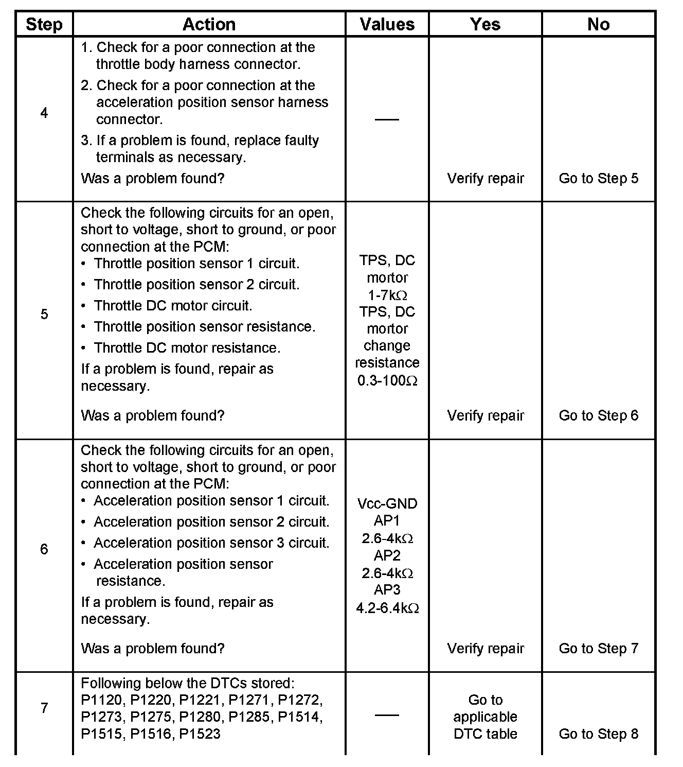 5. Check the following circuits for throttle valve and DC motor. Check the following TP sensor resistance and DC motor.