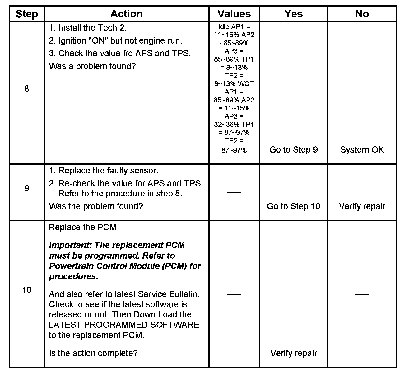 3. Visually/physically inspect for the following acceleration pedal conditions.