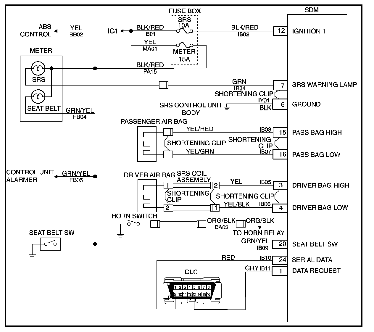 When the Sensing and Diagnostic Module (SDM) recognizes "ignition 1" voltage, applied to terminals "12", is greater than 9 volts, the "AIR BAG" warning lamp is flashed 7 times to verify operation. At this time the SDM performs "Turn-ON" tests followed by "Continuous Monitoring" tests. When a malfunction is detected, the SDM sets a current diagnostic trouble code and illuminates the "AIR BAG" warning lamp. The SDM will clear current diagnostic trouble codes and move them to a history file when the malfunction is no longer detected and/or the ignition switch is cycled, except for DTCs 51, 53 and 71. DTC 71 can only be cleared using a scan tool "Clear Codes" command in case that the malfunction on DTC 71 has been solved and no DTCs 51 and 53 were remained. DTCs 51, 53 and 71 can not be cleared after a "Clear Codes" command is issued.