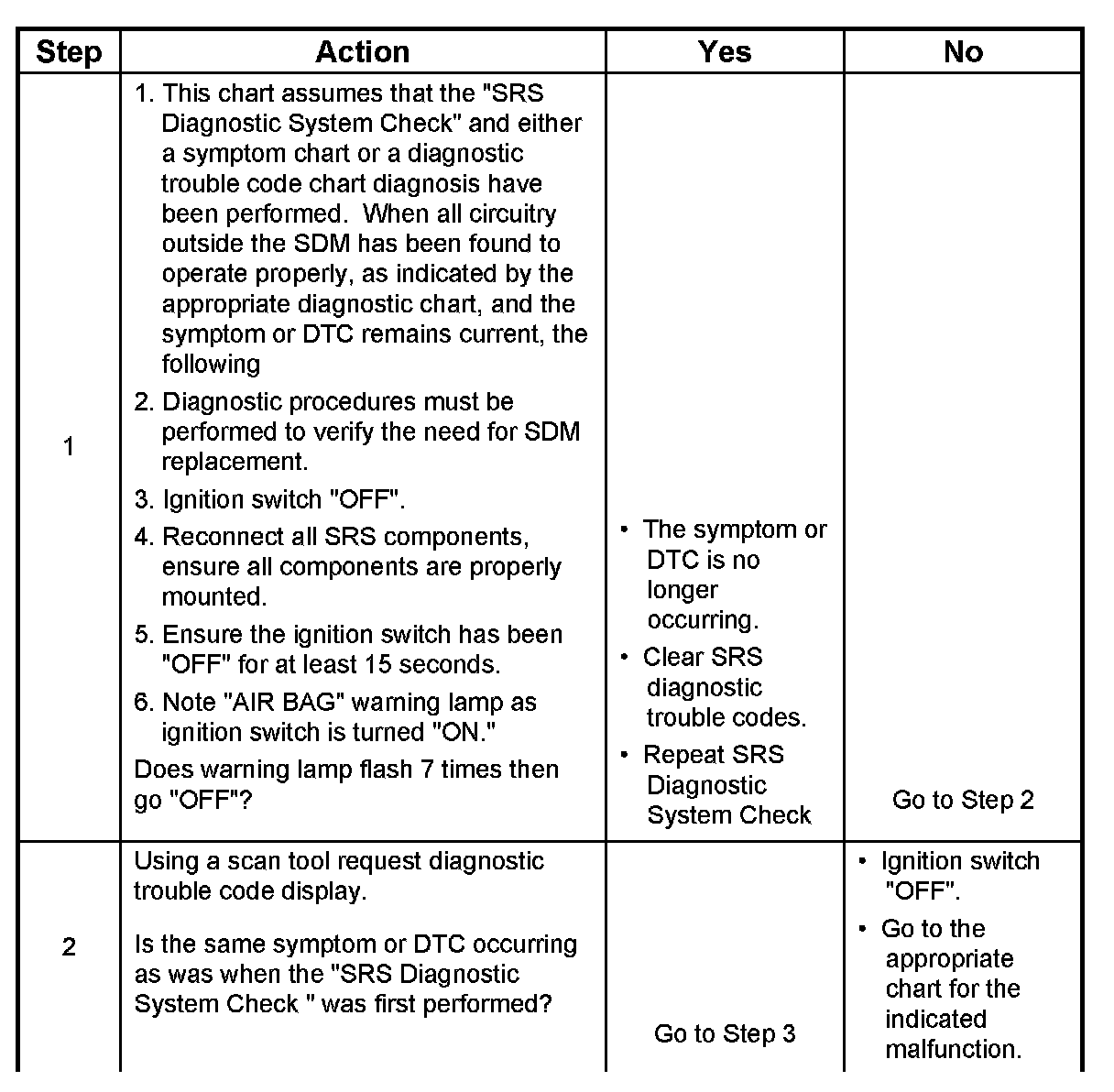 1. This test confirms a current malfunction. If no current malfunction is occurring (history DTC set) the "Diagnostic Aids" for the appropriate diagnostic trouble code should be referenced. The SDM should not be replaced for a history diagnostic trouble code.