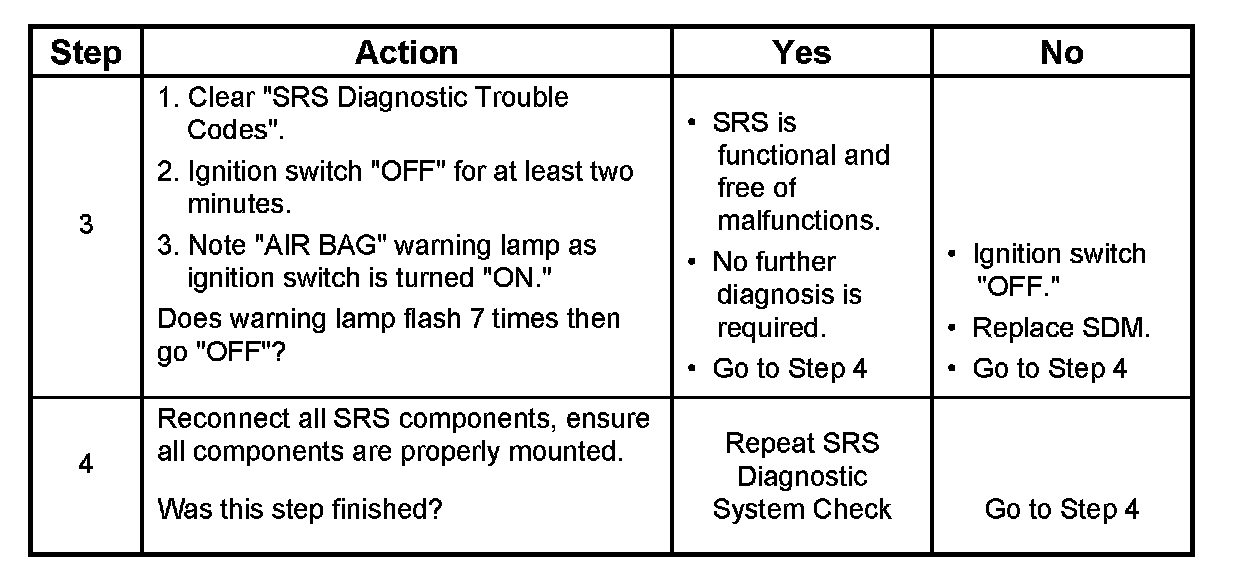 When the SDM recognizes "Ignition 1" voltage, applied to terminals "12", is greater than 9 volts, the "AIR BAG" warning lamp is flashed 7 times to verify operation. At this time the SDM performs "Turn- ON" tests followed by "Continuous Monitoring" tests. When a malfunction is detected, the SDM sets a current diagnostic trouble code and illuminates the "AIR BAG" warning lamp. The SDM will clear current diagnostic trouble codes and move them to a history file when the malfunction is no longer detected and/or the ignition switch is cycled, except for DTCs 19, 25, 51, 53 and 71. DTC 71 can only be cleared using a scan tool "Clear Codes" command. If DTCs 51, 53 are not indicated then DTC 71 is not existing. DTCs 51, 53 and 71 can not be cleared after a "Clear Codes" command is issued.