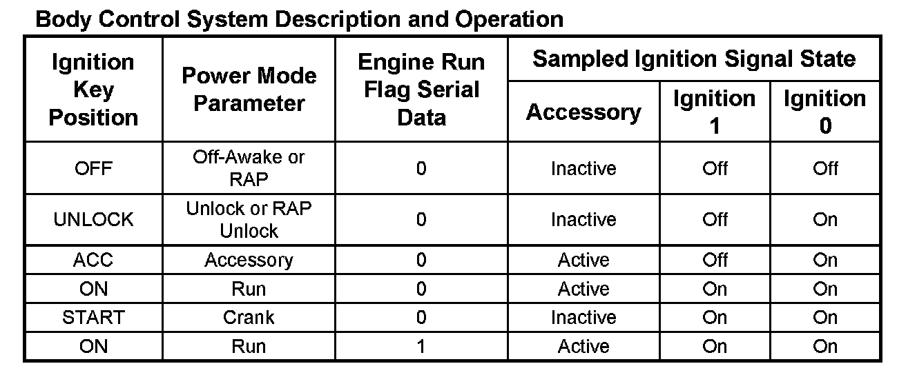 On vehicles that have several control modules connected by serial data circuits, one module is the power mode master (PMM). On this vehicle the PMM is the Body Control Module (BCM). The BCM receives 3 signals from the ignition switch. These are the Ignition 0, Ignition 1, and Accessory.