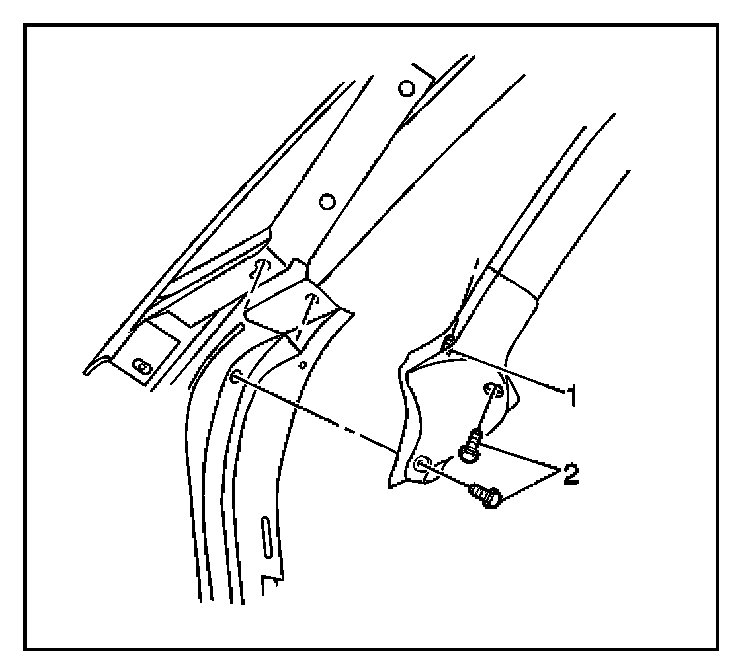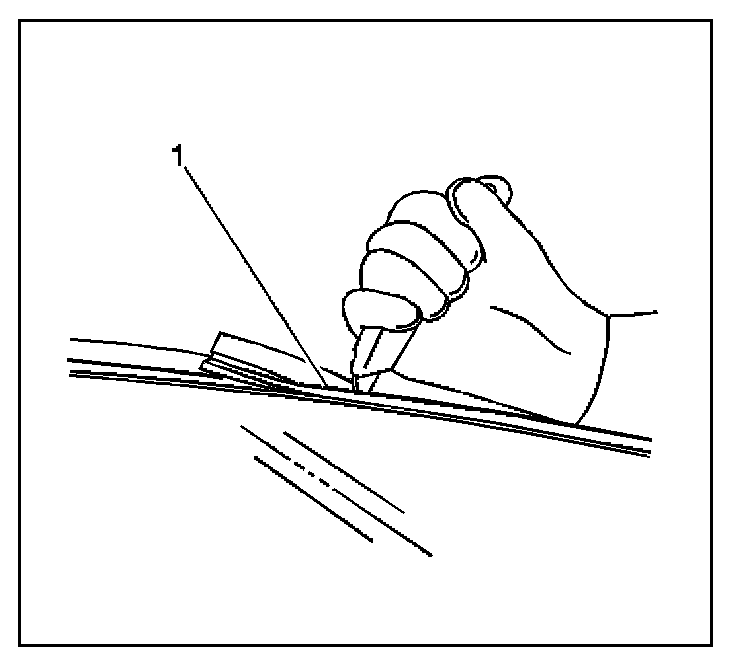 14. Remove the windshield lower supports (1) by using a flat bladed tool, lightly prying upward in the middle until it releases.