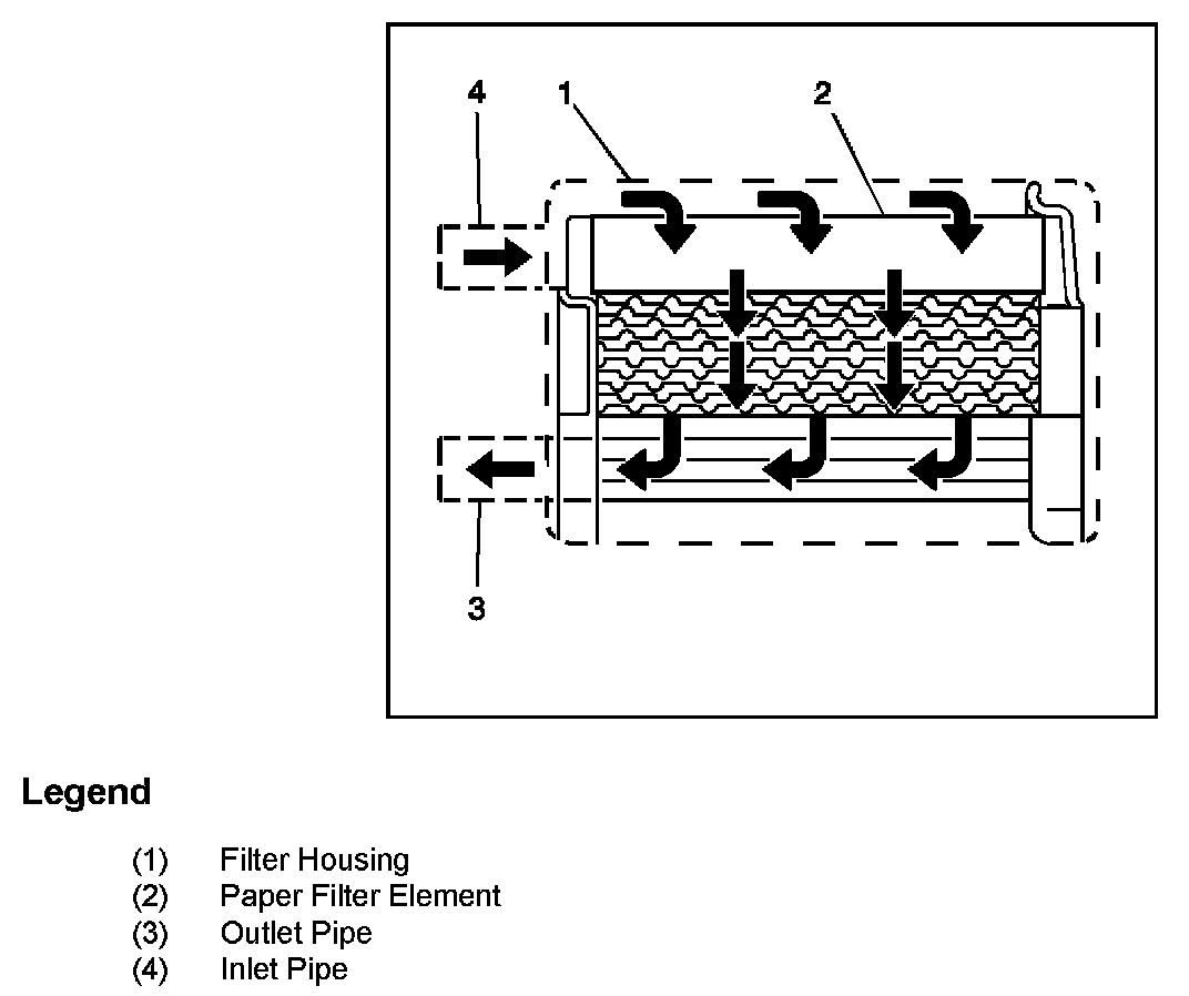 The fuel filter is located in the fuel feed pipe, between the fuel pump and the fuel injectors. The paper filter element (2) traps particles that may damage the fuel injection system. The filter housing (1) is made to withstand maximum fuel system pressure, exposure to fuel additives, and changes in temperature.
