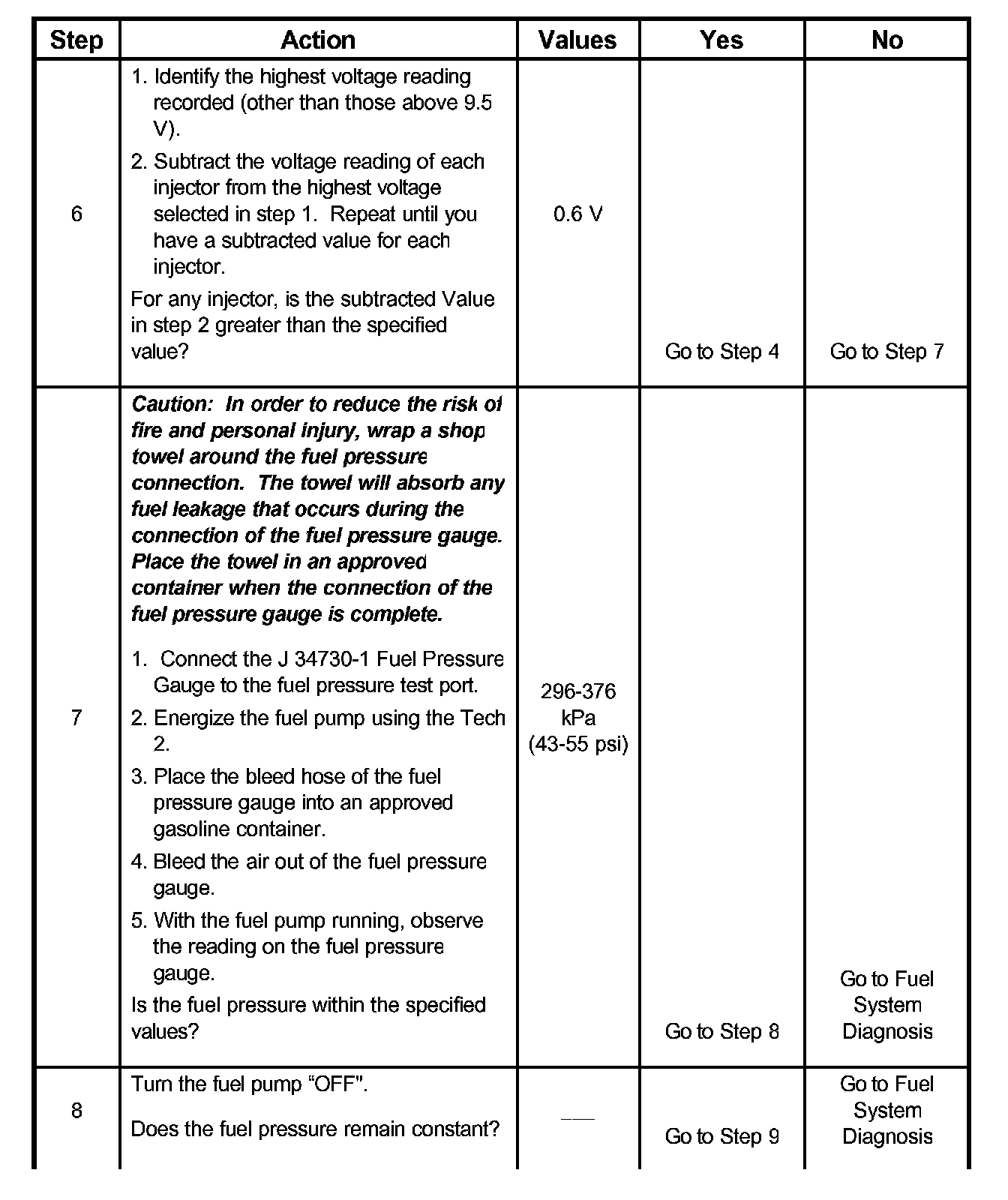 7. The Fuel Injector Balance Test portion of this chart (Step 7 through Step 11) checks the mechanical (fuel delivery) portion of the fuel injector.An engine cool-down period of 10 minutes is necessary in order to avoid irregular fuel pressure readings due to "Hot Soak" fuel boiling.