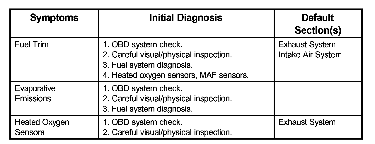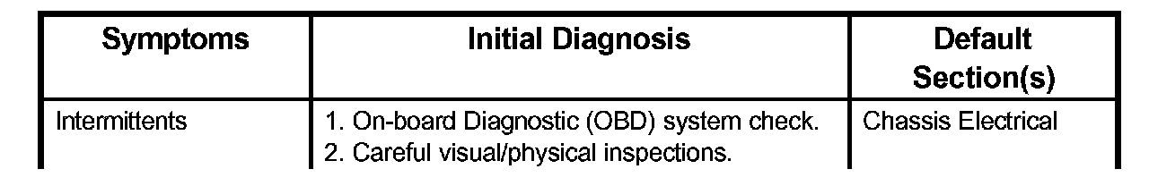 Service Procedure Default StrategyA referral strategy has been established to assist the technician with additional information when the cause of the failure cannot be determined. If no problem is found after performing diagnostics, then refer to the default matrix table for further diagnostic information.