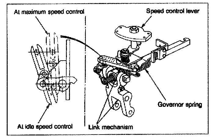 In the intermediate to high speed ranges, the guide plate causes the floating lever to move to increase the lever ratio continuously from 1.1 (idling) 6 (full speed). This increase in the lever ratio in the intermediate to high speed range improves speed droop.