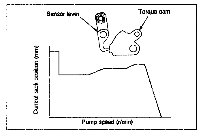 At full load, the tip of the sensor lever traces the face of the torque cam to determine the full load rack position and control the full load injection quantity.