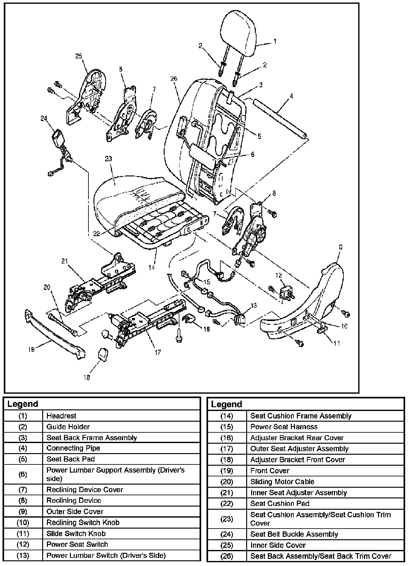 NOTE: The performance of the reclining device and the seat adjuster of a power seat are guaranteed by the set of the outer and inner. Because of this, make sure to replace the reclining device and seat adjuster by the set.
