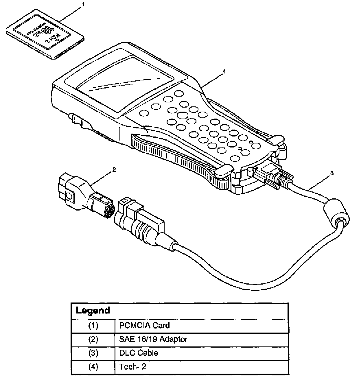 1. The Isuzu 98 System PCMCIA card (1) inserts into the Tech 2 (4).