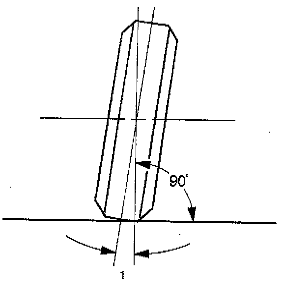 Caster (1) is the vertical tilting of the wheel axis either forward or backward (when viewed from the side of the vehicle). A backward tilt is positive (+) and a forward tilt is negative (-). On the short and long arm type suspension you cannot see a caster angle without a special instrument, but if you look straight down from the top of the upper control arm to the ground, the ball joints do not line up (fore and aft) when a caster angle other than 0° is present. With a positive angle, the lower ball joint would be slightly ahead (toward the front of the vehicle) of the upper ball joint center line.