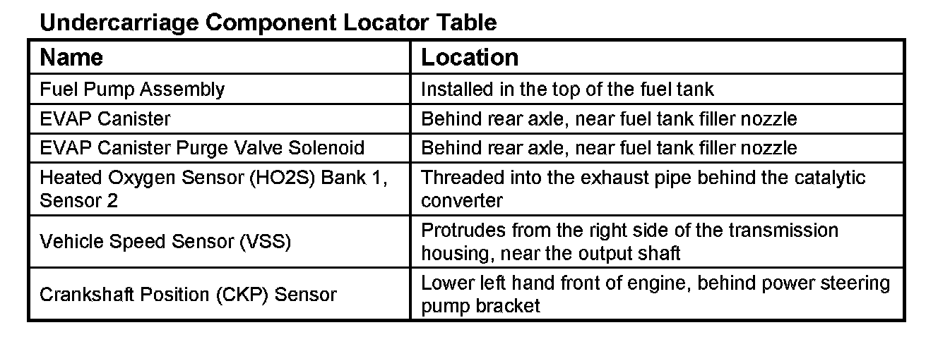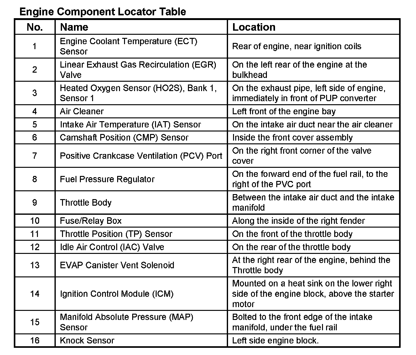 Engine Component Locator Table: