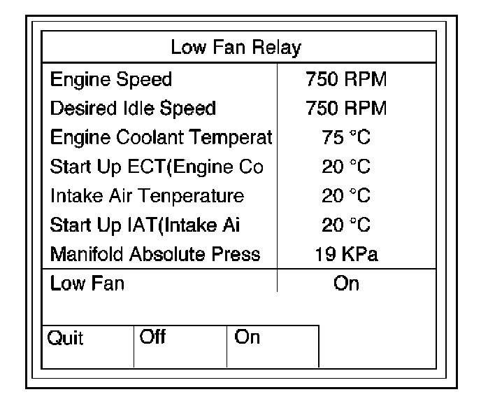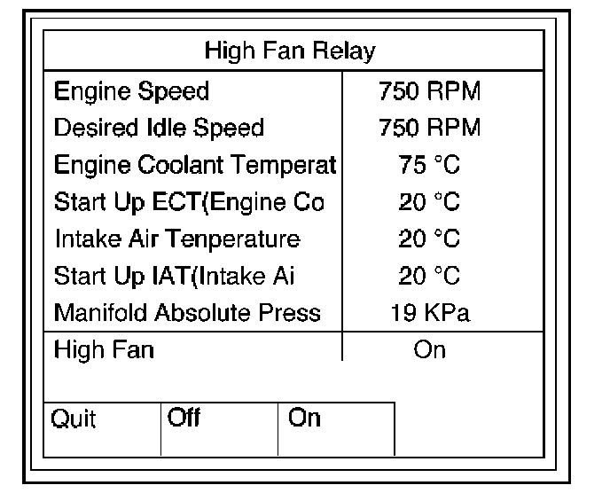 This test is conducted to check Fuel Pump Relay, A/C Clutch Low Fan and High Fan for proper operation.Tech 2 must be used for this test.
