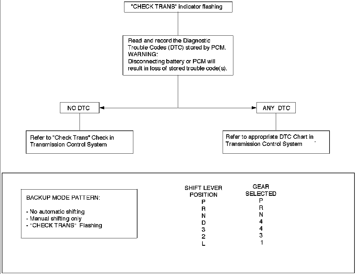 Perform Preliminary Inspection First!When the "CHECK TRANS" indicator is flashing, it indicates that a problem related to the transmission, the Powertrain Control Module (PCM), or the vehicle harness has occurred.