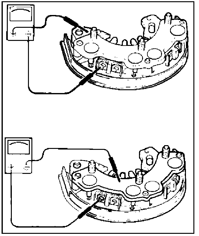 1. Measure the resistance between each diode terminal and aluminum diode fin in forward and reverse directions with the connection of the tester leads switched. The diodes are normal if resistance is nearly zero ohms in one direction and is infinitely high in the other direction.