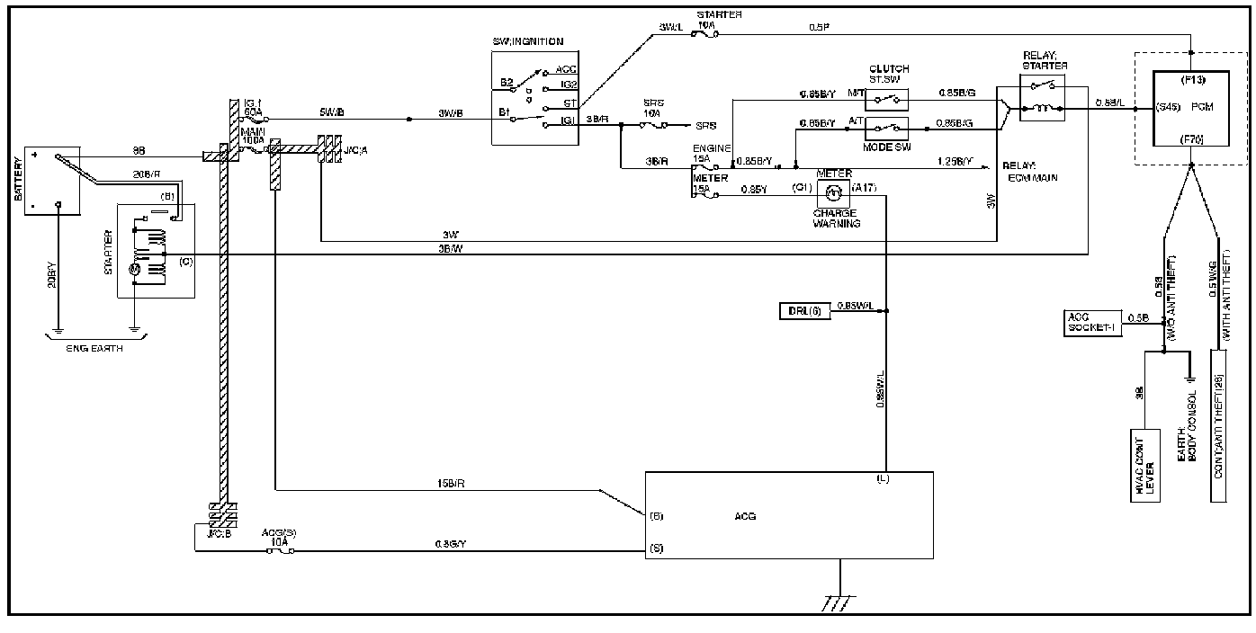 Battery voltage is applied at all times from the positive battery terminal to the starter switch and the normally open starter solenoid contacts. When the starter switch is turned to START and the automatic transmission mode switch (A/T) or clutch start switch (M/T) is closed, battery voltage is applied to the starter relay coil. The starter relay energizes and applies battery voltage to the starter solenoid coils. The starter solenoid coils energize, the starter solenoid contact closes, and battery voltage is applied to the starter motor. The starter motor engages to start the engine.