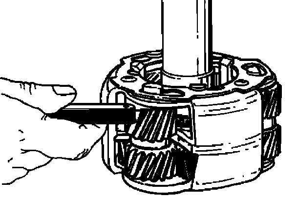 12. Align planetary pinions. Each pinion is marked with double points to indicate the master tooth space and exactly opposite with a single point to indicate the master tooth. The markings on the planetary carrier consist of double lines which are to be lined up with the double points on two opposite pinions; the single lines are to be lined up with the single points on the other two pinions.