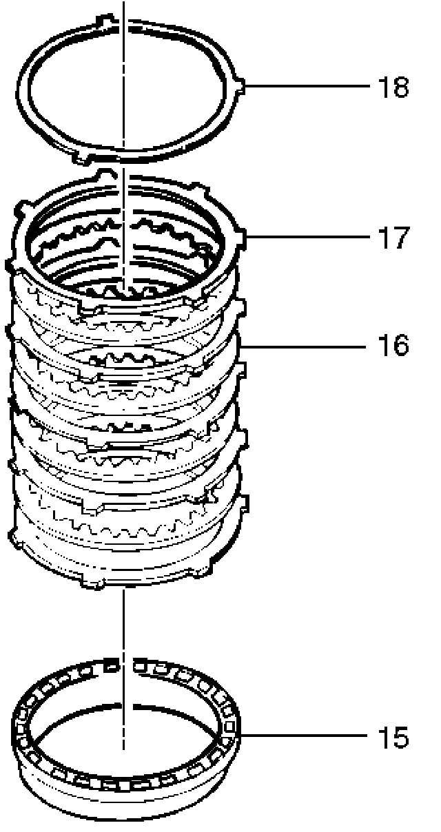 20. Install reverse clutch plates. Start with a steel plate (17) and alternate with a lined (16).
