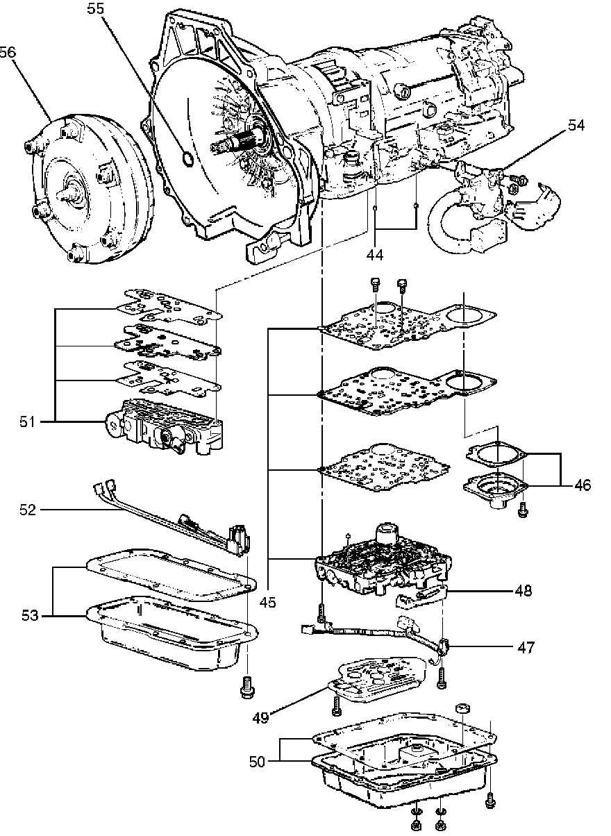 56. Connect wiring harness harness assembly (52) to converter clutch solenoid, force motor, and 4 way (V6) or 5 way (HEC) connector.