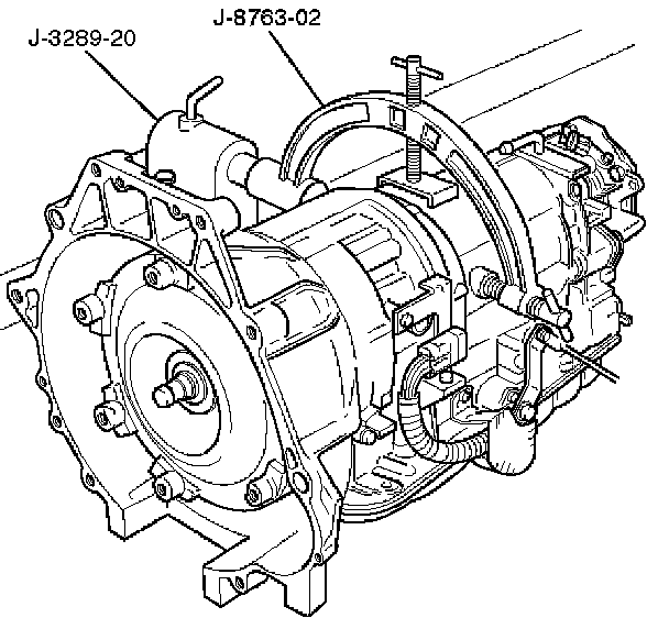 - Attach J-8763-02 holding fixture to the transmission and set it on J-3289-20 holding fixture base.