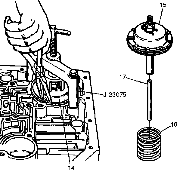- Install J-23075 servo piston spring compressor with offset to the rear of case.