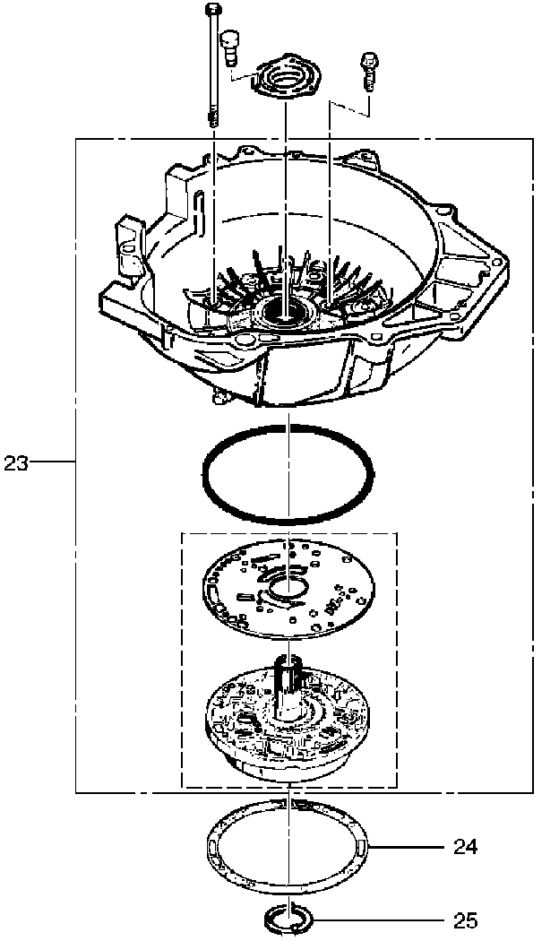 - Loosen the converter housing and oil pump assembly fixing screws, but do not remove, the five 13 mm inner screws unless oil pump disassembly is required.