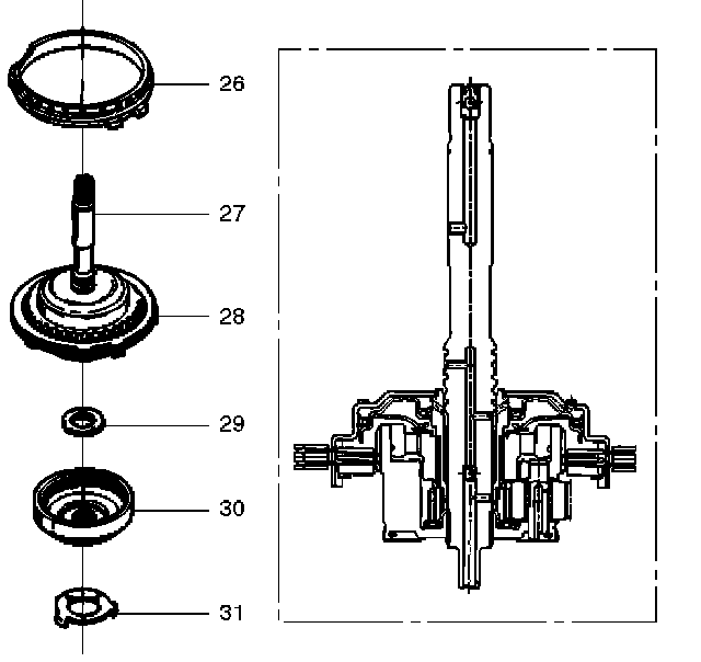25. Grasp turbine shaft and lift out the overrun clutch housing assembly (27) and fourth clutch plates (28).