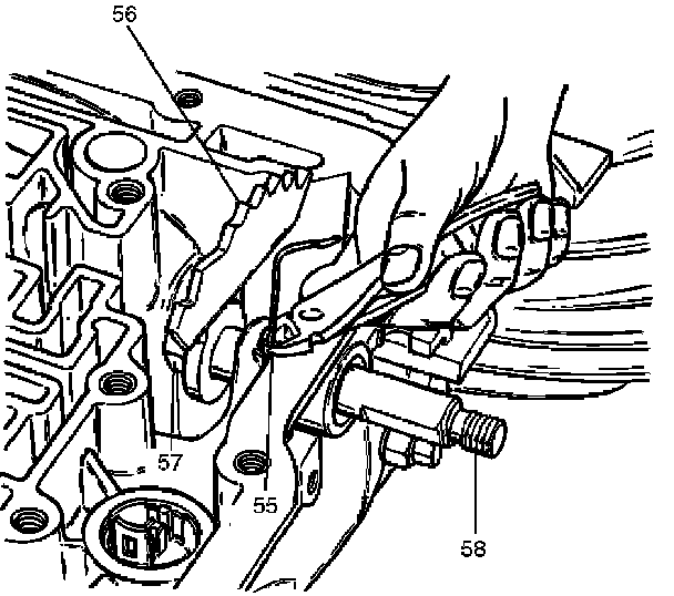 - Remove spring pin (55), using cutting pliers, then remove parking lock and selector lever assembly (56).
