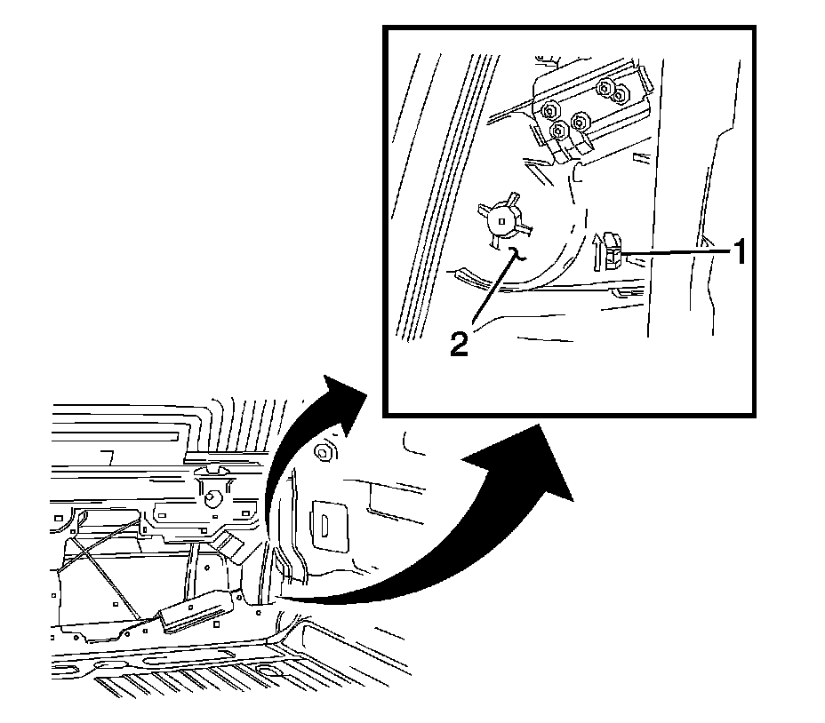 4. Locate the manual release lever (1), located on the upper and lower left latches (2).