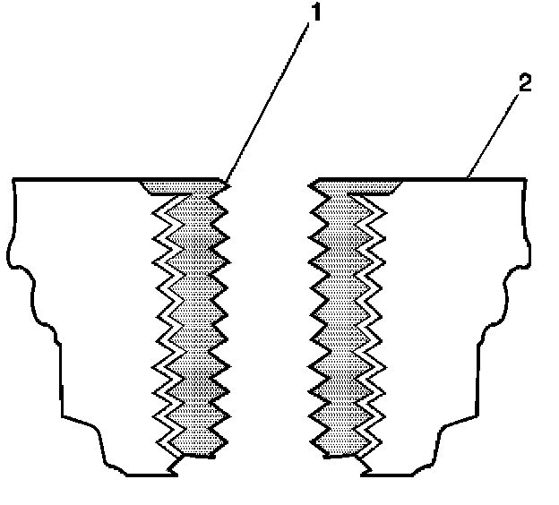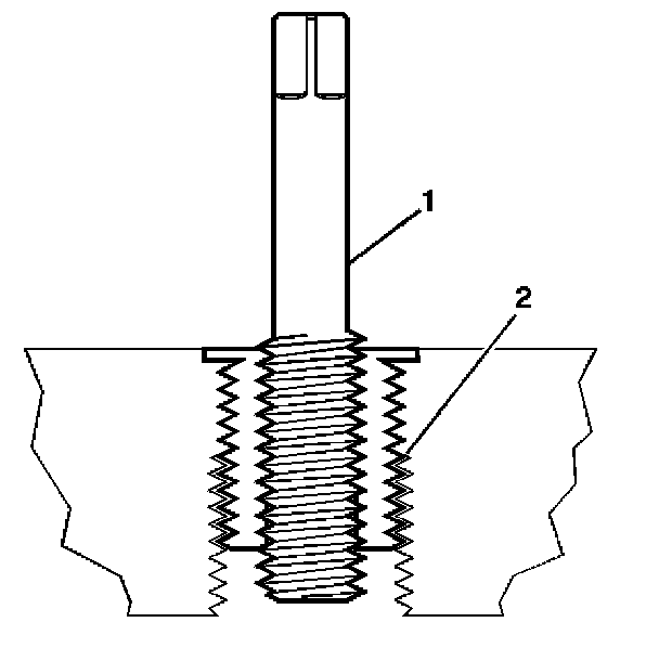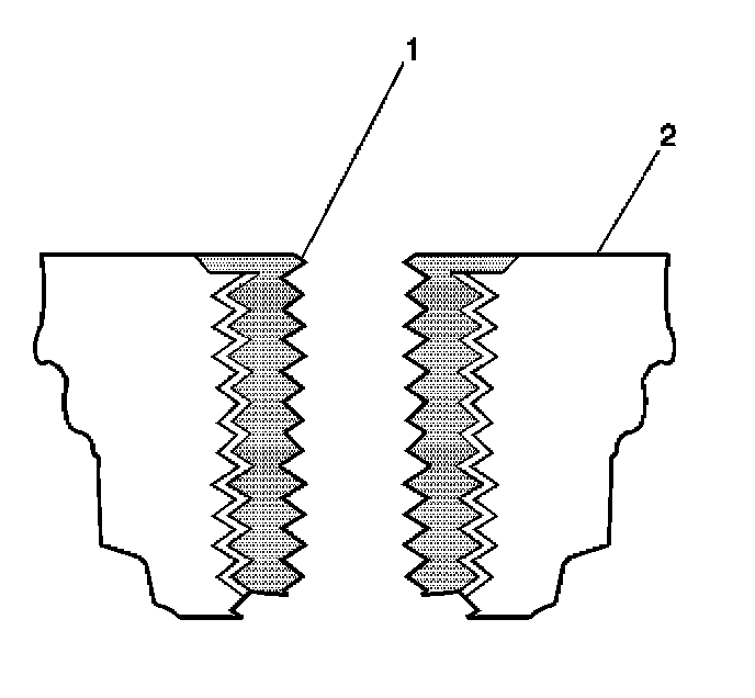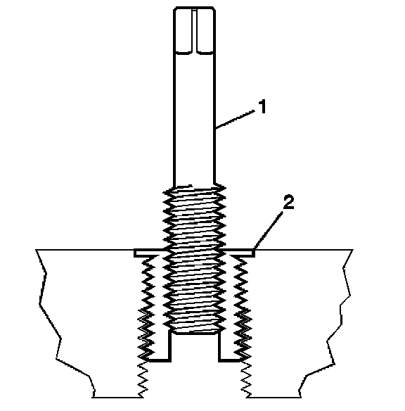 15. Inspect the insert for proper installation in to the tapped hole. A properly installed insert (1) will be either flush or slightly below flush with the surface of the base material (2).