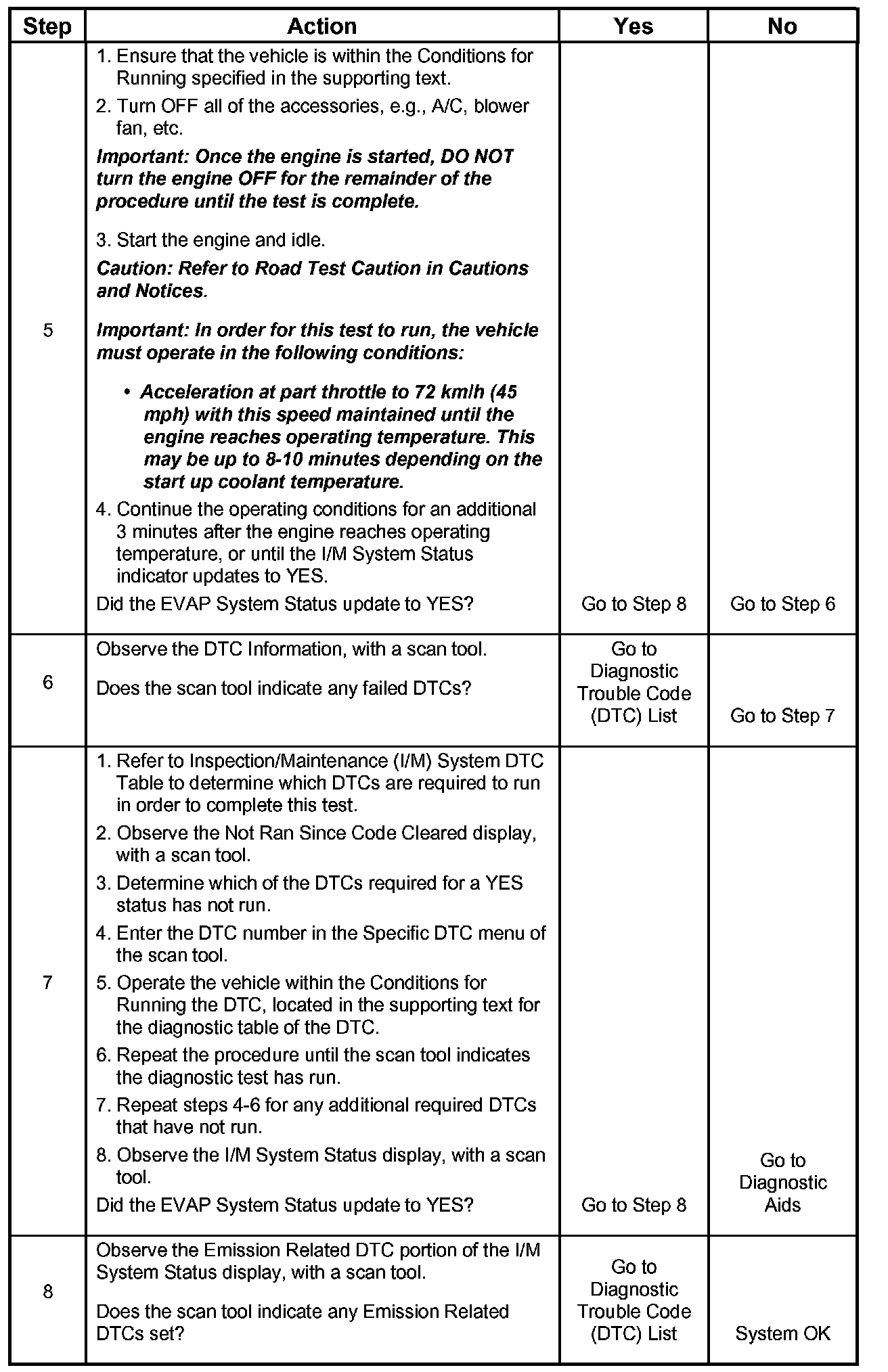 The first failure of a type B DTC does not constitute a final determination of pass or fail, and will not update the I/M System Status to YES. A second trip is required, and all the conditions to run must be met in order for the test to run again. These conditions may include a partial to complete engine cool down.