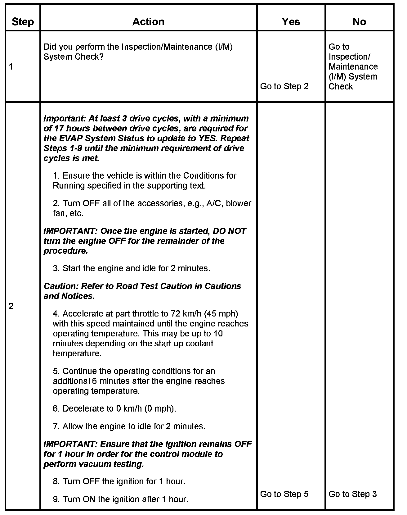The procedure may be used to set the EVAP I/M System Status display on the scan tool to YES. The EVAP I/M System Status display indicates whether or not the control module has completed the readiness diagnostics. The readiness diagnostics complete when all DTCs comprising the diagnostics run and pass, or any DTC comprising the diagnostics illuminates the malfunction indicator lamp (MIL). If the diagnostics pass during one drive cycle, seventeen hours must elapse, regardless of whether the vehicle is driven or not. Then, the diagnostics will run again during the next drive cycle in which the conditions for running are met. Once the diagnostics have passed during the third drive cycle, the EVAP I/M System Status display will be updated to YES. A failed or aborted diagnostic will require vehicle to cool down in order to meet the enable criteria for another drive cycle. Therefore, performing a visual inspection prior to running the EVAP test may prevent having to repeat the drive cycle.