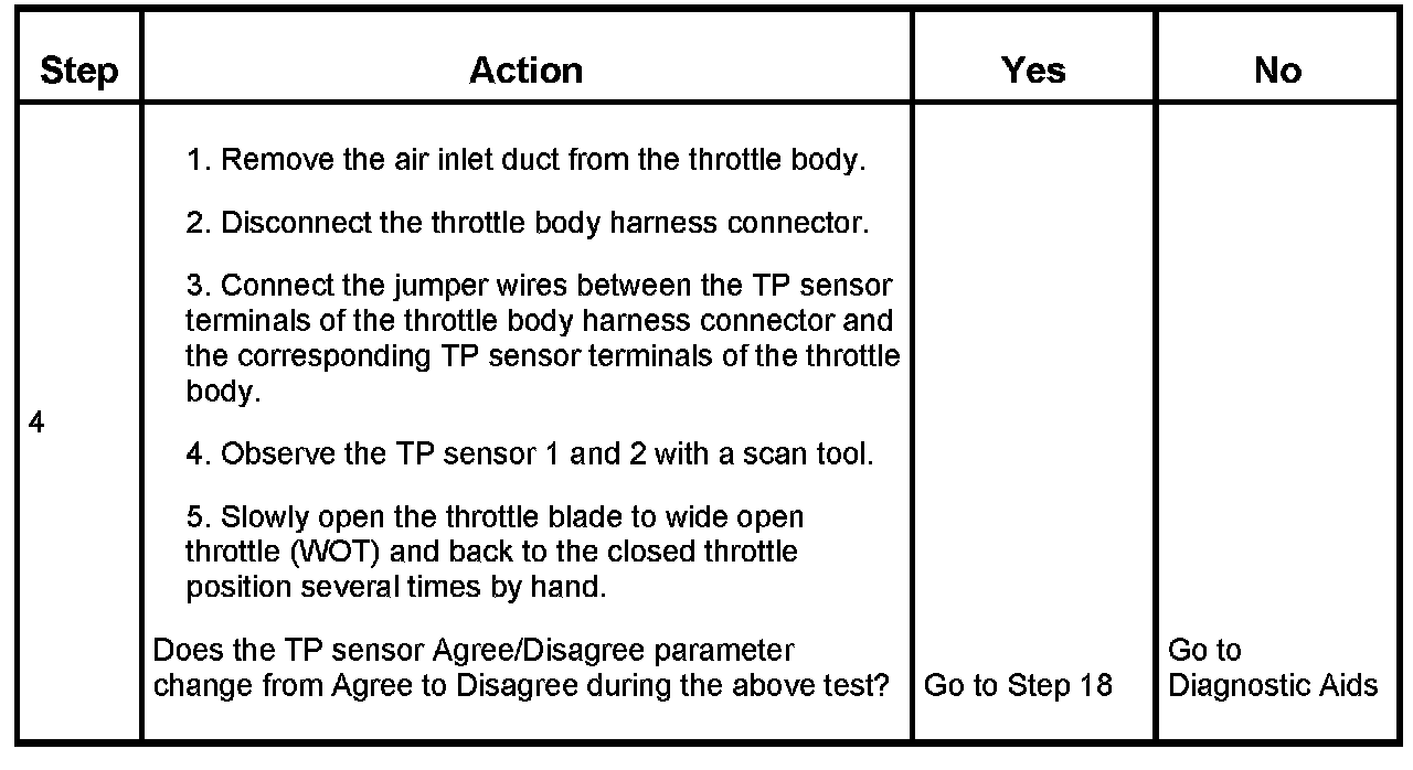 Step four (4) of DTC P2135 in the Engine Controls and 5.3L sub-section of the Service Manual has been revised. Step four (4) now includes the use of jumper wires. Use the chart shown when performing this operation.