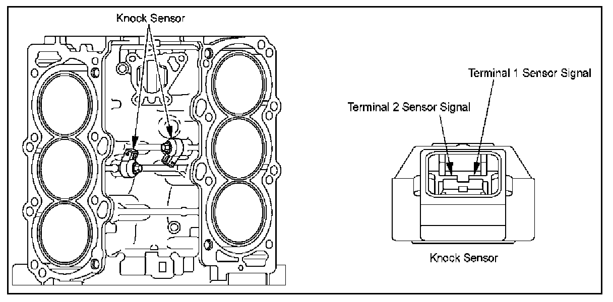 Knock SensorAs before, the knock sensor contains an element that converts detection of knock into an electrical signal, and is mounted toward the right and left on the block between the two banks of cylinders. When the ECM (Engine control Module) receives a signal that indicates knock, the ECM orders ignition timing to be adjusted to compensate.