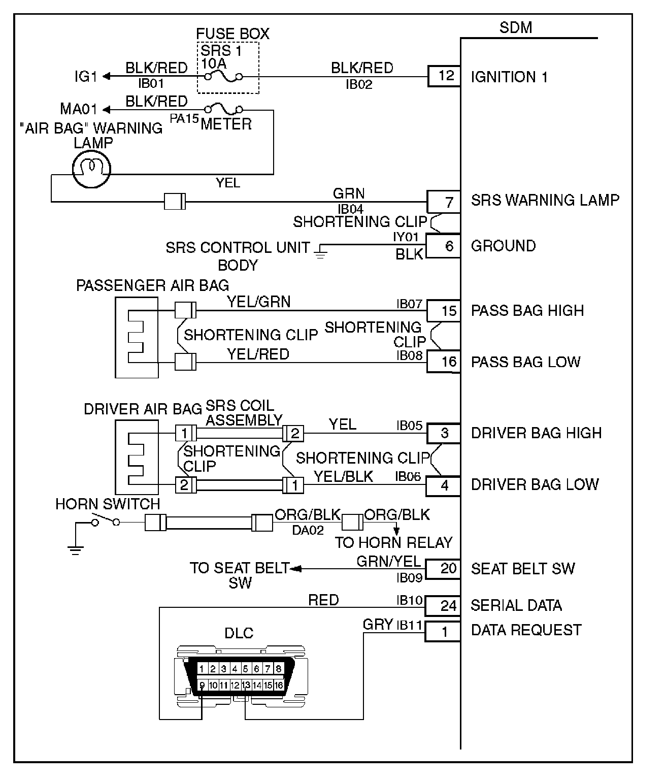 The SRS consists of the Sensing and Diagnostic Module (SDM), the driver air bag assembly, the SRS coil assembly, the passenger air bag assembly, and the "AIR BAG" warning lamp in the instrument cluster. The SDM, SRS coil assembly (driver side only), driver air bag assembly, passenger air bag assembly and connector wire make up the deployment loops. The function of the deployment loops is to supply current through air bag assembly, which will cause deployment of the air bags in the event of a frontal crash of sufficient force, up to 30 degrees off the centerline of the vehicle. The air bag assemblies are only supplied enough current to deploy when the SDM detects vehicle velocity changes severe