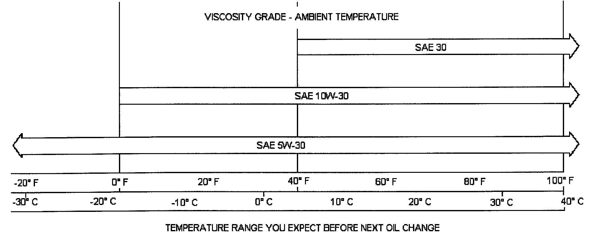 Engine oil viscosity (thickness) has an effect on fuel economy. Lower viscosity engine oils can provide increased fuel economy however, higher temperature weather conditions require higher viscosity engine oils for satisfactory lubrication. To get the best fuel economy with your vehicle, you should use a fuel saving engine oil of the proper viscosity. These oils can be found in service stations and other retail stores. They are identified by words such as: "Energy Saving", "Gasoline Saving", "Conserves Gasoline", "Friction Reducing", Improved Mileage", or "Fuel Savings". The chart lists the engine oil viscosities recommended for the temperature range you expect before the next oil change. For temperatures above -18°C (0°F), SAE 10W-30 is the preferred viscosity grade. If cold weather starting problems are encountered at temperatures below -18°C (0°F), SAE 5W-30 viscosity oils may be required.
