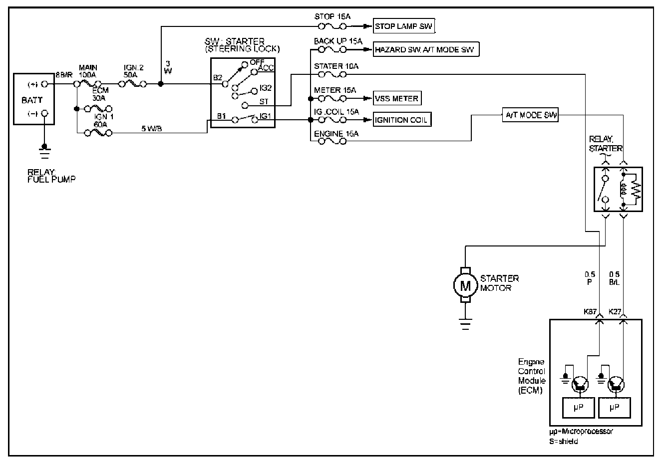 Ignition feed voltage is supplied to the MODE switch and starter relay through the engine fuse. ECM turns the starter relay "ON" by grounding the starter relay driver circuit.