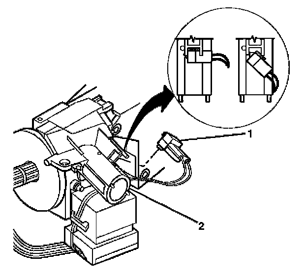 8. Insert J 42759 into the ignition lock cylinder case (1) and slide the ignition switch (2) out.