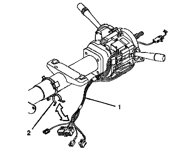 3. Remove the wire harness strap (2) from the steering column and the wire harness assembly (1).