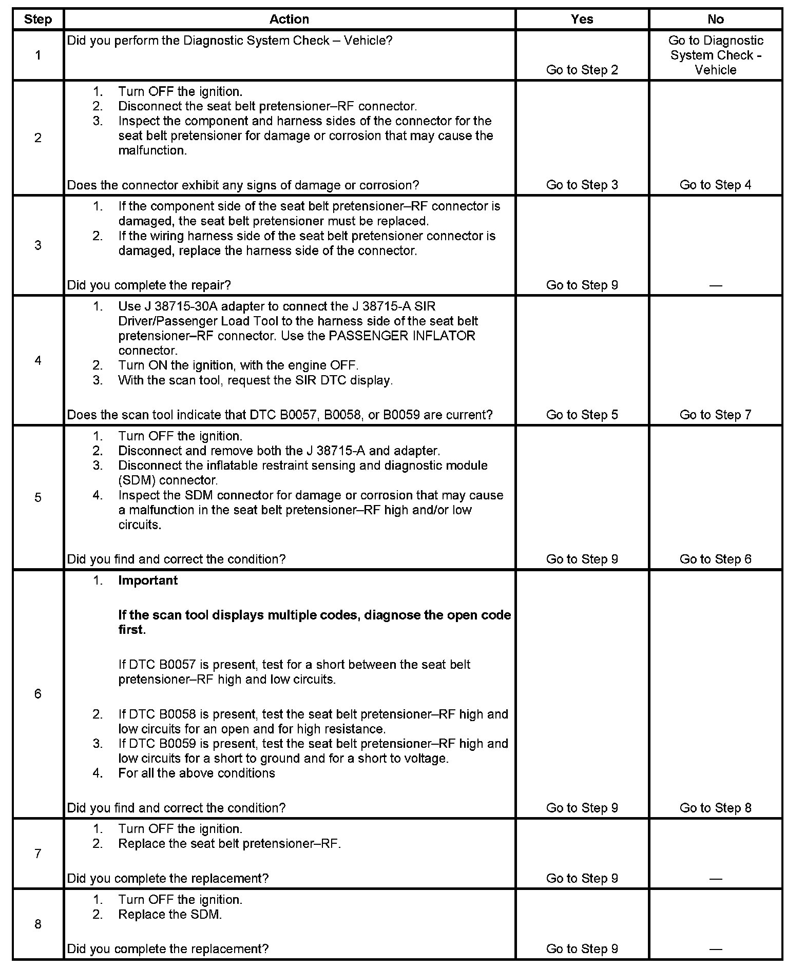 The passenger seat belt pretensioner deployment loop consists of a seat belt pretensioner-RF and the seat belt pretensioner-RF high and low circuits. A shorting bar used within the seat belt pretensioner connector shorts together both the seat belt pretensioner high and low circuits when the connector is disconnected. This will help to prevent unwanted deployment of the pretensioner during servicing. During a frontal crash of sufficient force the inflatable restraint sensing and diagnostic module (SDM) will allow current to flow through the deployment loop in order to deploy the seat belt pretensioner. The SDM performs continuous diagnostic tests on the deployment loops to check for proper circuit continuity and for shorts to ground or voltage. If a malfunction is detected, a diagnostic trouble code (DTC) will be stored in memory.